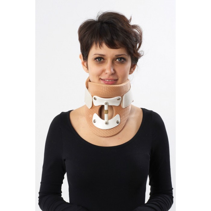 12 mm. ithal ten rengi İngiliz plastizotundan iki parça olarak yapılan boyunluğun tüm kenarları yuvarlanmış,ısıyla boyun anatomisine uygun kalıplarla şekil verilmiştir.Boyuna önden ve arkadan istenilen yükseklik ayarını yapabilmek için; Önde ve arkada plastizot üzerine açılan deliklerin üst ve alt taraflarına foreksten kalıplarla şekillendirilmiş destekler yerleştirilmiştir.Desteklere düz ve ters diş açılmış plastik silindirler monte edilmiş.Silindirler arasına takılan çift taraflı diş açılmış metalle de ayar mekanizması tamamlanmıştır.Ayar mekanizması alt ve üst kısmı eşit aralıklarla açıp kapamaktadır.Ayar mekanizmasının 2 cm. açıp kapama kapasitesi vardır. Plastizot üzerine açılan deliklerle cildin hava alması sağlanmış,plastizot üzerine yapılan baklava desenleriyle boyunluğun stabilizesi arttırılmıştır. 5 boy olarak üretilen boyunluğun ön ve arka kısmında bulunan ayar mekanizmaları kısa ve uzun boyunlara kolaylıkla uygulanmasını sağlamaktadır. ENDİKASYON: Cervical dejenerasyonlarda ve travmalarda, cervical ameliyatlar sonrasında,boyunu traksiyona almada,acil hasta naklinde kullanılır.
